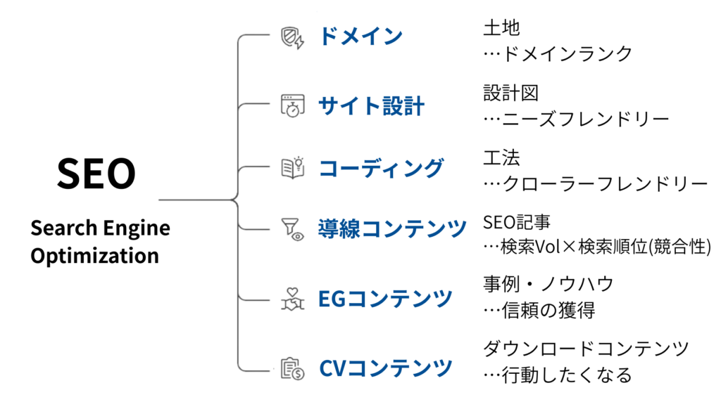 SEOは記事制作だけの話ではありません。ドメインの強さ、サイト設計、コーディング、そしてコンテンツの役割分担まで含めた総合設計で考える必要があります。
