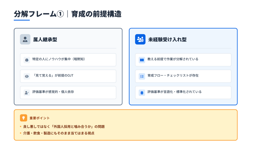 外国人採用がうまくいくかどうかは、国籍でも、業界でもなく、「企業の育成前提構造」によって大きく左右されます。