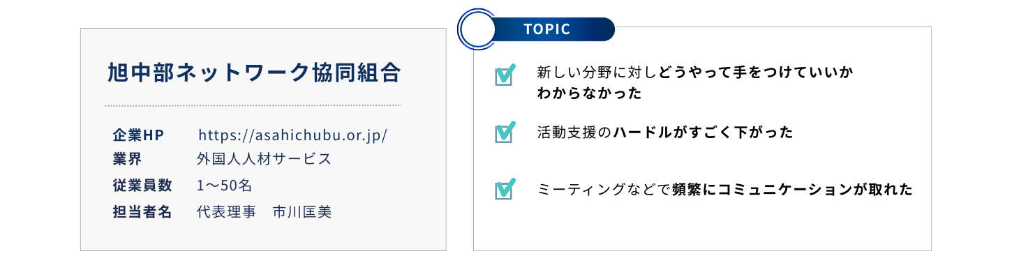 今いる組合員さんが皆さん製造業なので、製造業の方にしか認知されていないことが課題でした。これまで営業は一切せず、今いる組合員さんのご紹介のみでしたが、別の職種の方々にも組合員になっていただきたいと思い、活動支援をお願いしようと思いました。