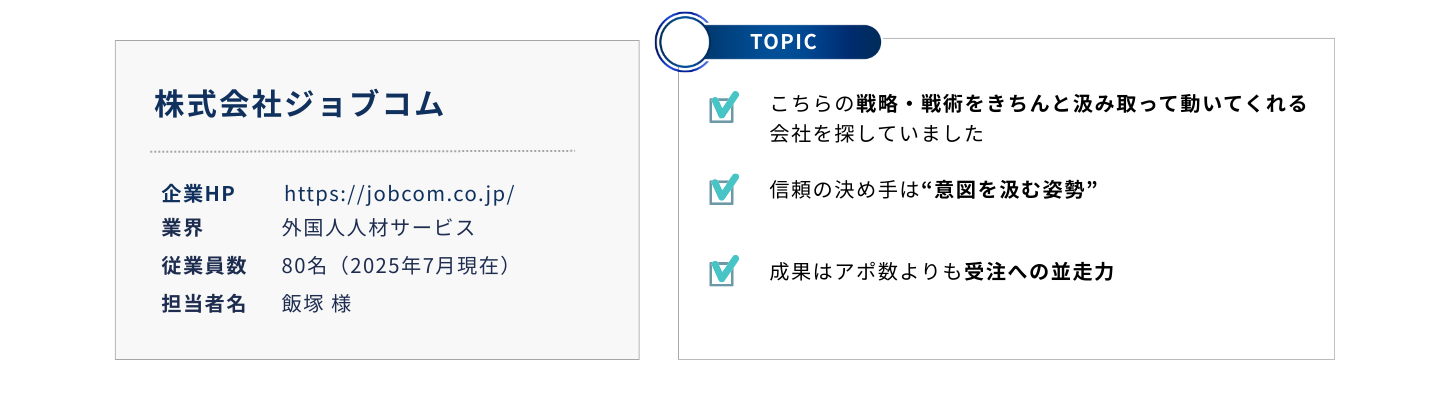 でも本音としては、アポ獲得だけでなく、受注までを見据えた動きをしてもらえるとありがたいというのが正直なところです。そのあたりの理想と現実のギャップ、そしてどこまで深く関わってもらうかというバランスの取り方は、今も模索している部分ですね。