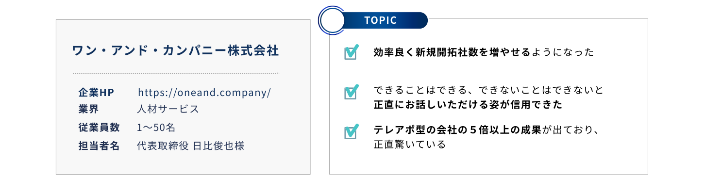 時間的だけでなく心理的にもハードルの高いリード獲得をお任せすることで効率良く新規開拓社数を増やせるようになりました。