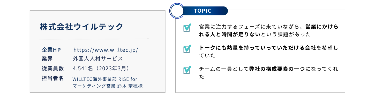 彼らの需要に応えるためにも企業様への営業に注力するフェーズに来ていながら、営業にかけられる人と時間が足りないという課題もありましたので、Google広告も継続しながら、営業代行を検討していました。