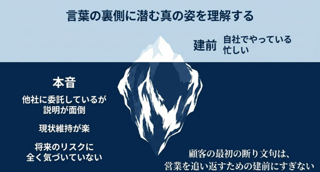 多くの営業担当者がこの言葉を額面通りに受け取り、引き下がってしまっているのが現状ではないでしょうか。